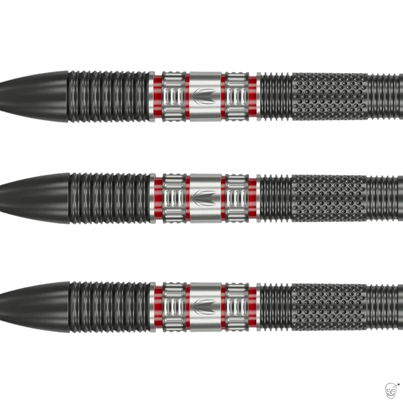 Featuring a 95% high-density tungsten barrel, offering exceptional durability and a slim profile for superior control. The barrels are designed with radial grooves and milling, enhanced by a black PVD coating for style and resilience. Striking red accents throughout the barrel add a bold visual element, and spot UV finishes for a high-end, polished look.