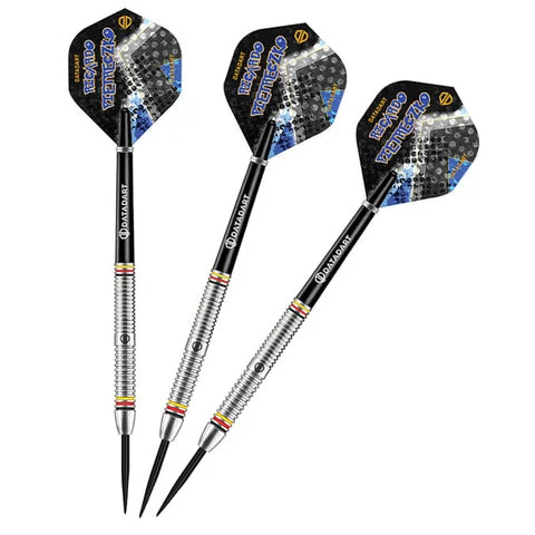 The Ricardo Pietreczko darts feature a straight barrel with Radial cuts enhancing your grip. The dart is finished in natural tungsten with coloured rings to the front and rear, the Datadart logo is laser etched on the centre of the barrel. 80% Tungsten Barrels, One set of Ricardo’s new signature flights and black Datadart signature stems.