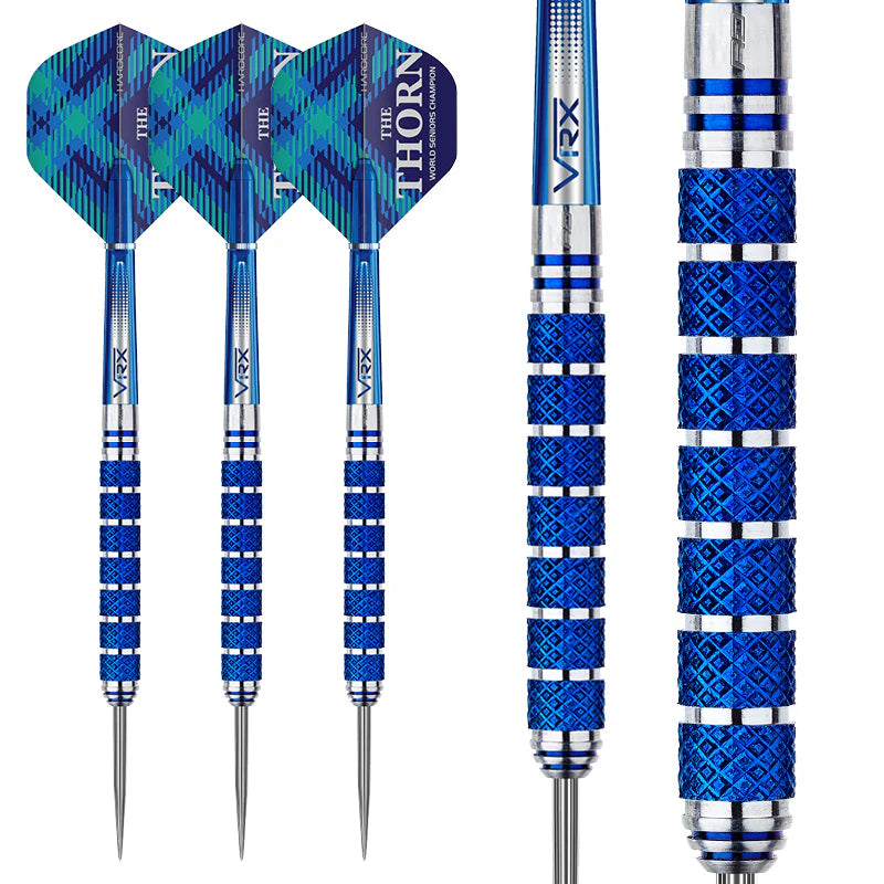 Robert’s latest Special Editions feature his trademark extra heavy knurled parallel barrels with their hugely aggressive grip. This latest knurled edition has been colour coded in Cobalt Blue with VRX shafts and his very latest THORN World Seniors Champion Flight design.