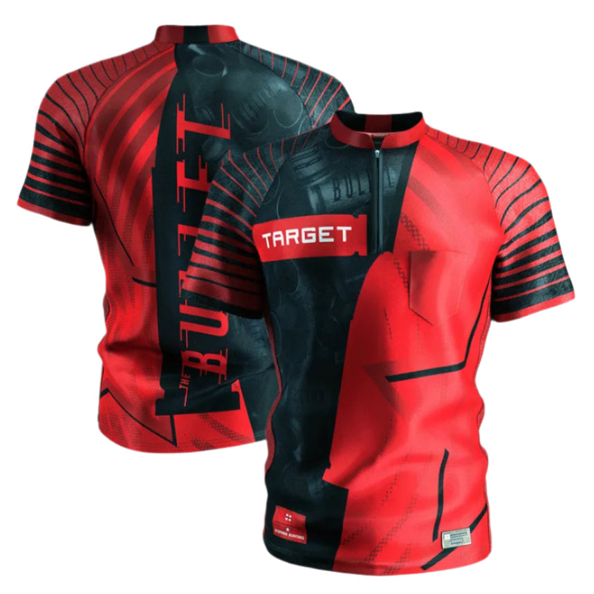 The shirt features a bold two-tone design, with bright red on one side and a prominent star symbolising his 2014 World Championship win. The other side is a sleek black, adorned with bullet graphics that pay homage to his darting nickname. “The Bullet” is proudly displayed in bold red text across the back, making this shirt as dynamic and impactful as Stephen’s presence on the oche.