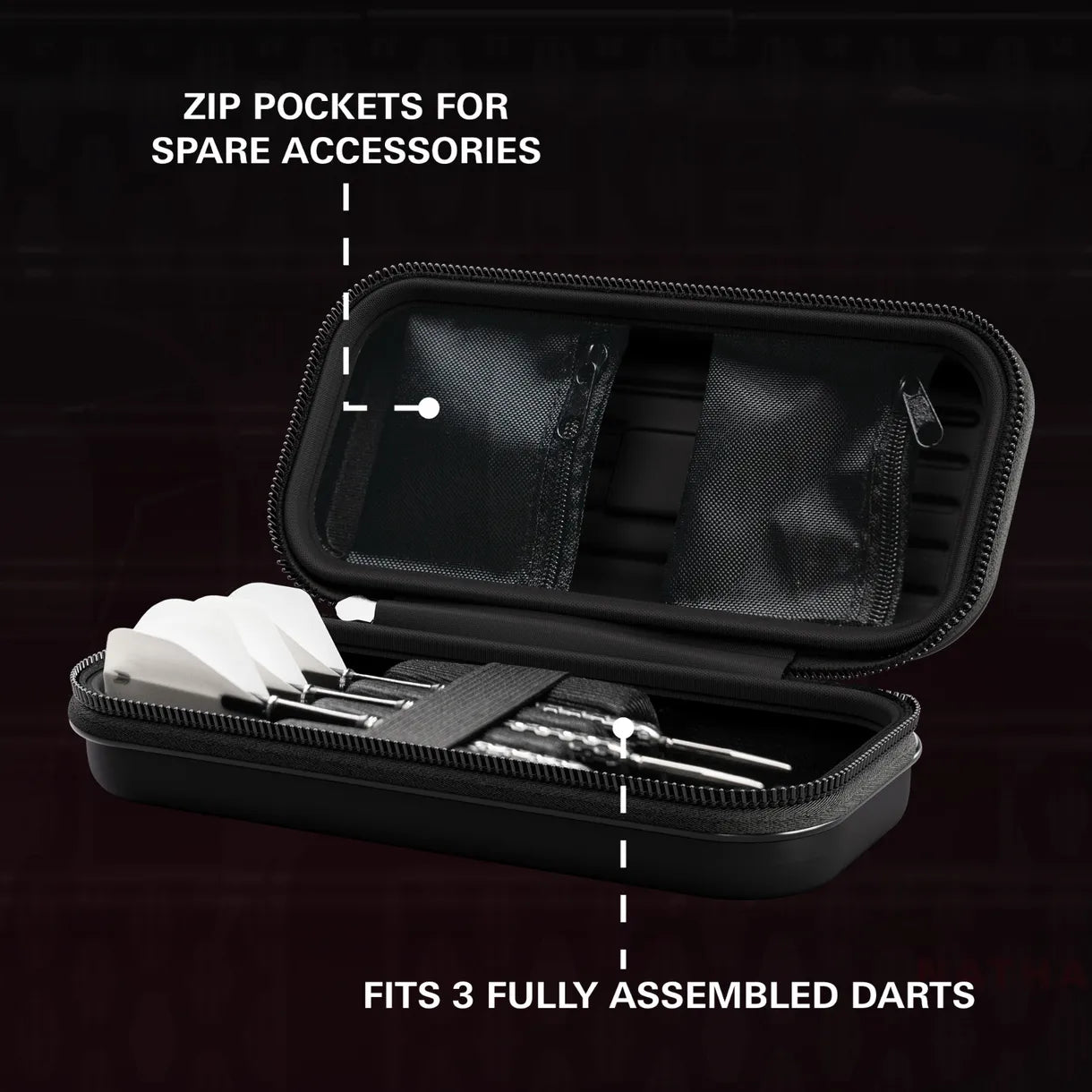 Built with a tough hard-shell exterior, the Takoma keeps your darts secure and protected. The scratch-resistant interior holds three fully assembled darts, while zip compartments provide space for spare flights, shafts, Swiss Points, and your Swiss Point tool. Combining style, practicality, and Nathan Aspinall’s signature energy, this wallet is a premium case for serious players.