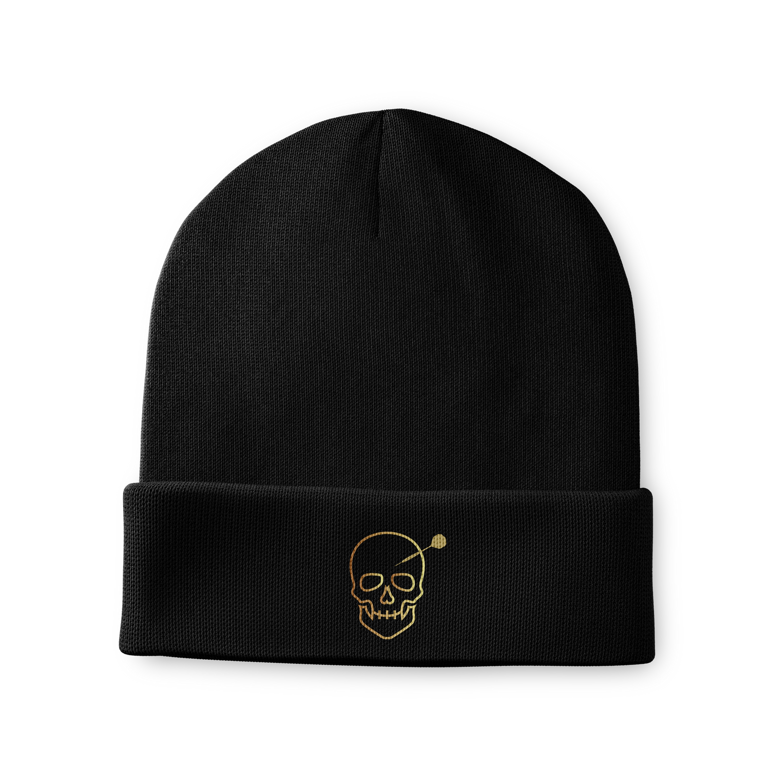 Crafted from premium, snug-knit fabric, this sleek black beanie features a bold, gold-stitched skull-and-dart design that makes a statement without saying a word. Whether you're at the oche or out on the town, this beanie keeps your head warm and your style even cooler.