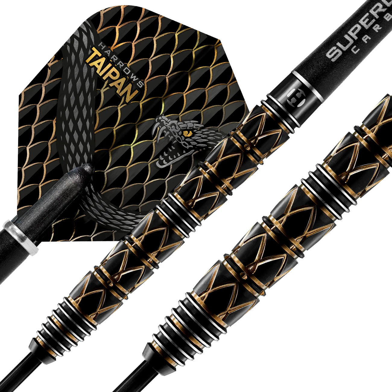 Taipan darts are supplied with Silver Supergrip Carbon midi shafts, new 100 micron Taipan flights and are match weighed to +/- 0.05g.
