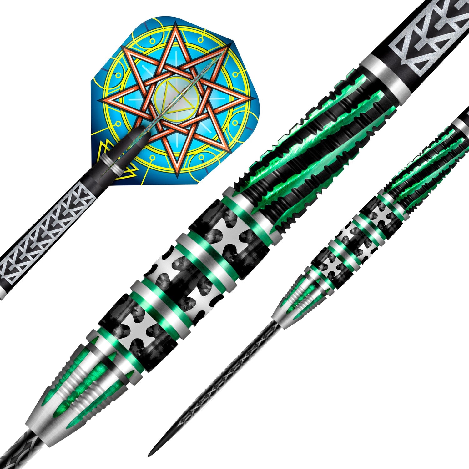 The highest-ranking and most learned among all the Celts, the Druid embodies the sacred soothsayer and seer of ancient Britain's wild, mist-shrouded places. This 90% tungsten, pencil shaped barrel is wreathed in forest green over black titanium. A long curved, tapered nose features raised arrowhead Vs for clear finger placement. In the mid-section, a forceful Rebellion grip. At the rear, the ringed Alchemy grip with its V cuts overlaid with spirals - the perfect foil for Rebellion when rolling the darts in your fingers. Consult the inner wisdom of Druid before entering the fray, and you shall surely emerge victorious.