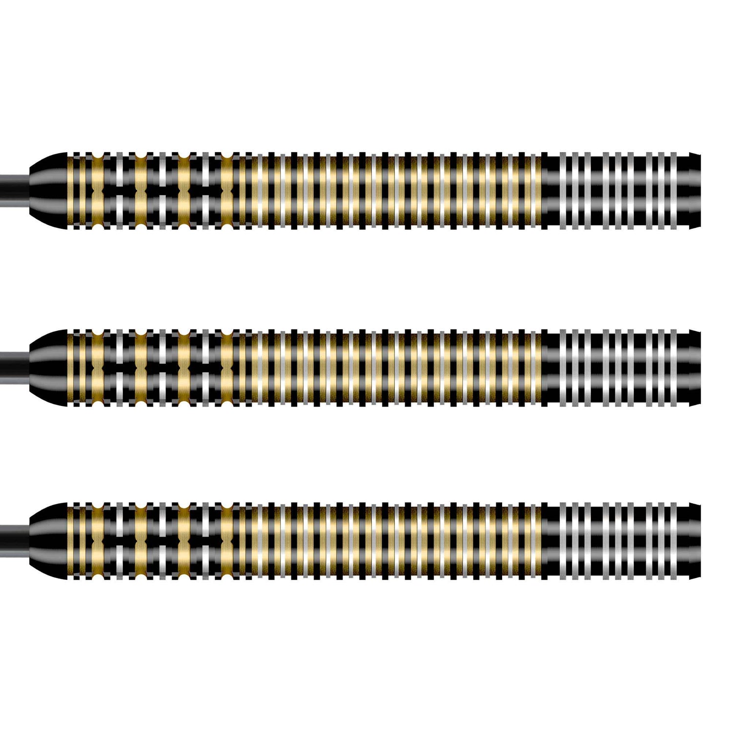 Up front, 45-degree milling adds multidirectional traction, ideal for players who steady the dart with a front finger. A classic bullnose keeps the profile slim, clean, and built for accuracy. Triple silver rings at the tail add a smoother feel, flowing into edgy gold rings and re-machined silver grooves that form a confident, controlled grip zone. In a premium black and gold finish, this set is engineered to match the Madhouse confidence on the oche.